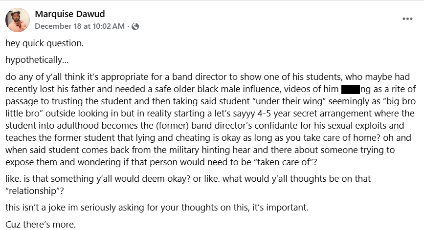 The former student Marquise Covington, 30, initially framed the accusation as a “hypothetical” in a Facebook post before alleging that it was factually accurate as to the relationship between Williams and himself: “let me be clear that’s it’s not hypothetical and I am talking about my experience as a junior at Southern High School and the band director was the now mayor Leonardo Williams.”