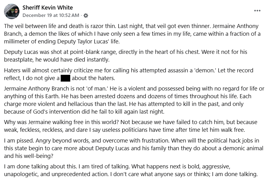White shared his frustration in an unfiltered Facebook post excoriating the “weak, feckless, reckless, and dare I say useless politicians” and “political hack jobs” who ensured that the suspect Jermaine Anthony Branch, 40, was out on the street despite “dozens and dozens” of arrests throughout his life.