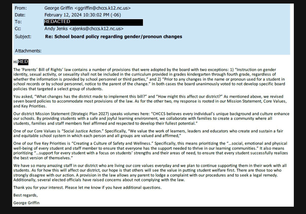 In written testimony for the committee, CHCCS superintendent Robert Trice maintained that while the CHCCS Board chose not to implement the two measures from the Parents’ Bill of Rights as board policy, they were nonetheless implemented as district policy and procedure, such as “Staff Guidance” which instructed employees to warn students wishing to change their name or pronouns that parental notice was required by state law: